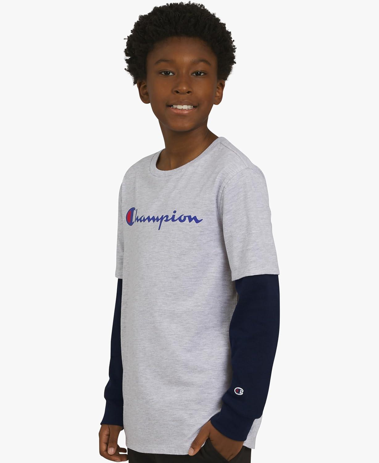 Champion Boys’ Long Sleeve Tee Shirt for Kids Athletic Tops(Grey Navy)