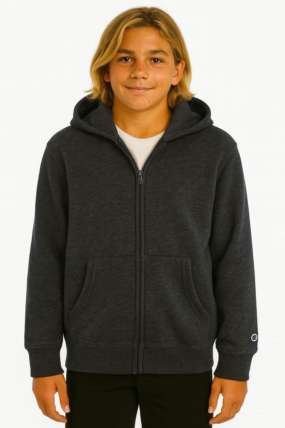 A wardrobe essential for cooler days, this Champion boys zip front fleece hoodie delivers warmth, comfort, and athletic style in one versatile piece. Crafted from a durable and soft 60% cotton, 40% polyester fleece, this boys zip hoodie is designed for everyday wear—from the schoolyard to weekend lounging. The full-zip front makes for easy layering, while the cozy fleece lining provides lasting comfort. A subtle embroidered Champion logo on the arm adds a signature touch to this boys sweatshirt. Available in a range of go-to colors like black, grey heather, dark forest green, lychee, and more, it’s the perfect year-round layer for play, school, or just hanging out. This boys fleece hoodie is machine washable and made to hold up through every adventure. Whether he's active outdoors or relaxing at home, this Champion zip hoodie is a reliable staple for any kid’s closet.