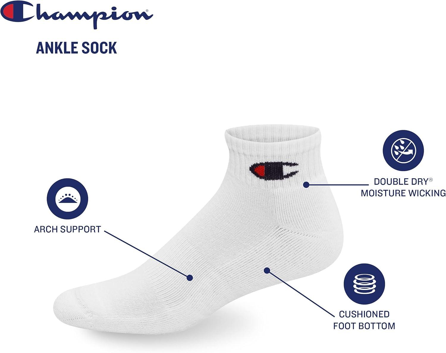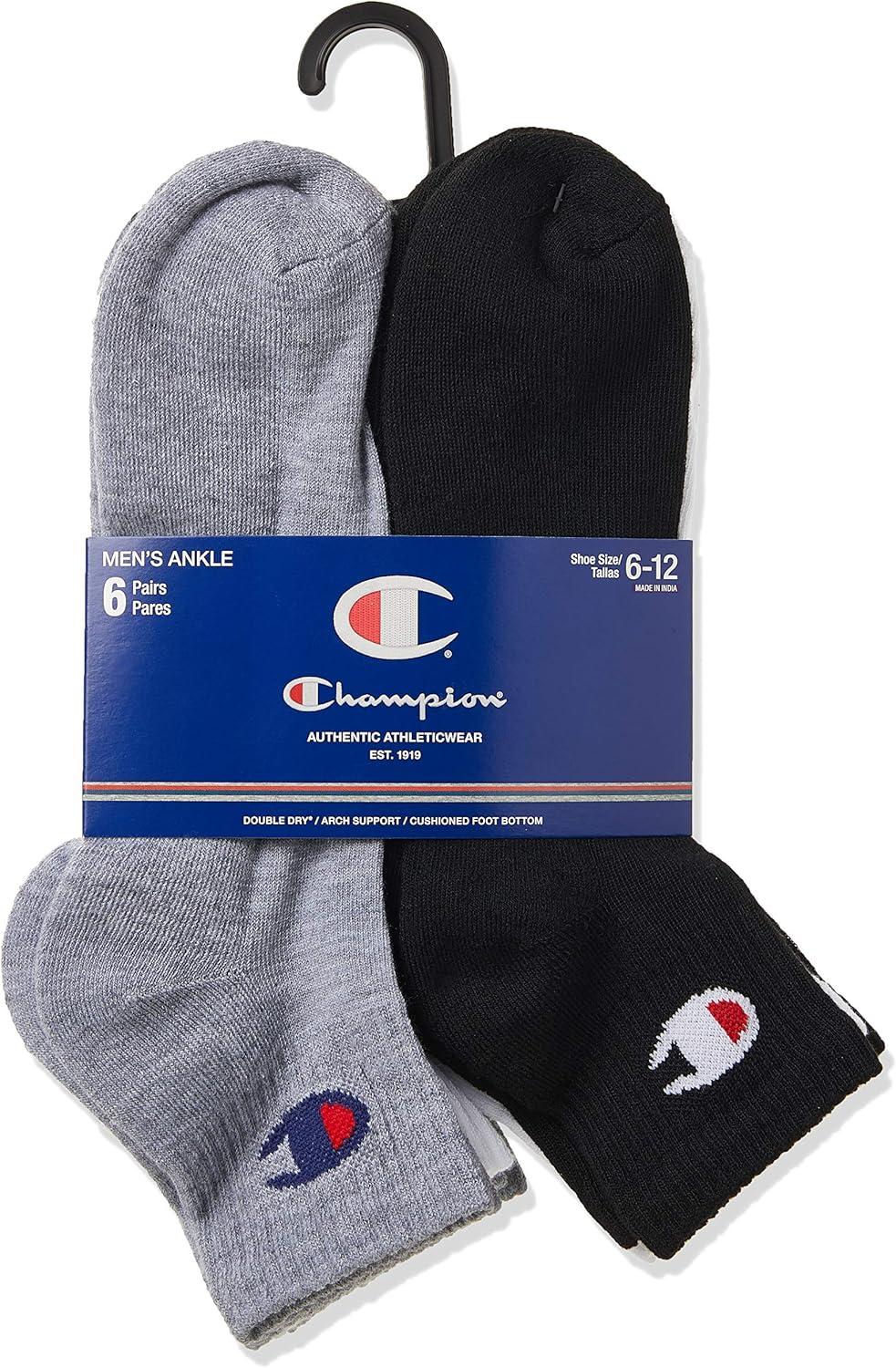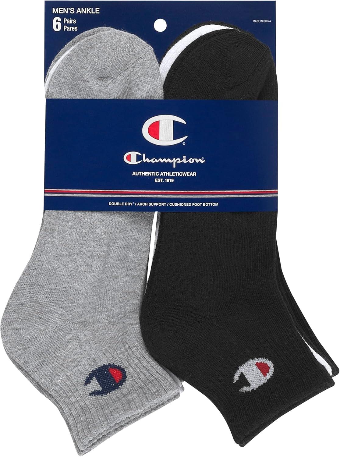 Champion Men's Ankle Socks – 6-Pack Moisture-Wicking Athletic Socks with Cushioning & Arch Support (Size 6-12)(White/Grey/Black - 6 Pack)