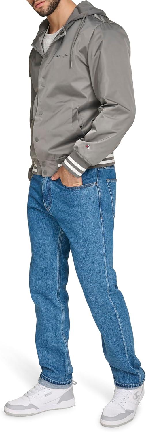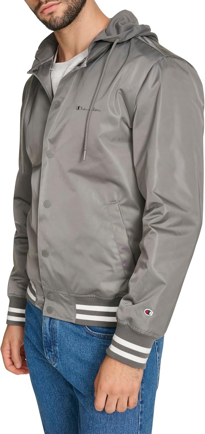 Convenient Welt Pockets: Two lower welt pockets for secure storage and easy access to essentials. Snap-Zipper Closure: Center front snap zipper placket for a stylish and functional closure with an adjustable fit. Lightweight Fabric: Soft and breathable material for comfort and flexibility, perfect for layering. Classic Rib Knit Detailing: Stripe rib knit at the hem and cuff for a traditional varsity look with added stretch. Adjustable Hood: Drawstring at the hood allows for a customizable fit and extra warmth when needed.
