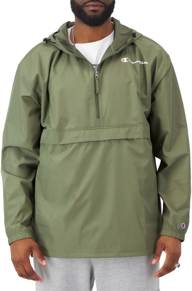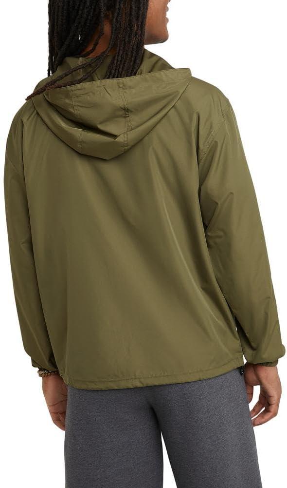 WEATHER ANY STORM. Wind-resistant and water-resistant, this ultra-light men's rain jacket can be towed along on all your outdoor endeavors. Ready to protect you from the elements, it features a full-zip front, a scuba-style neckline, and a hood with a bungee cord closure. This jacket is roomy enough for easy layering over your best Champion sweatshirt. Smart details include rain flaps in front and back, elastic cuffs that keep out wind and rain, and a bungee cord hem that adjust for a custom fit. This rain jacket for men has front pockets that keep essentials close. The iconic script logo at the left chest is recognizable on and off the field.