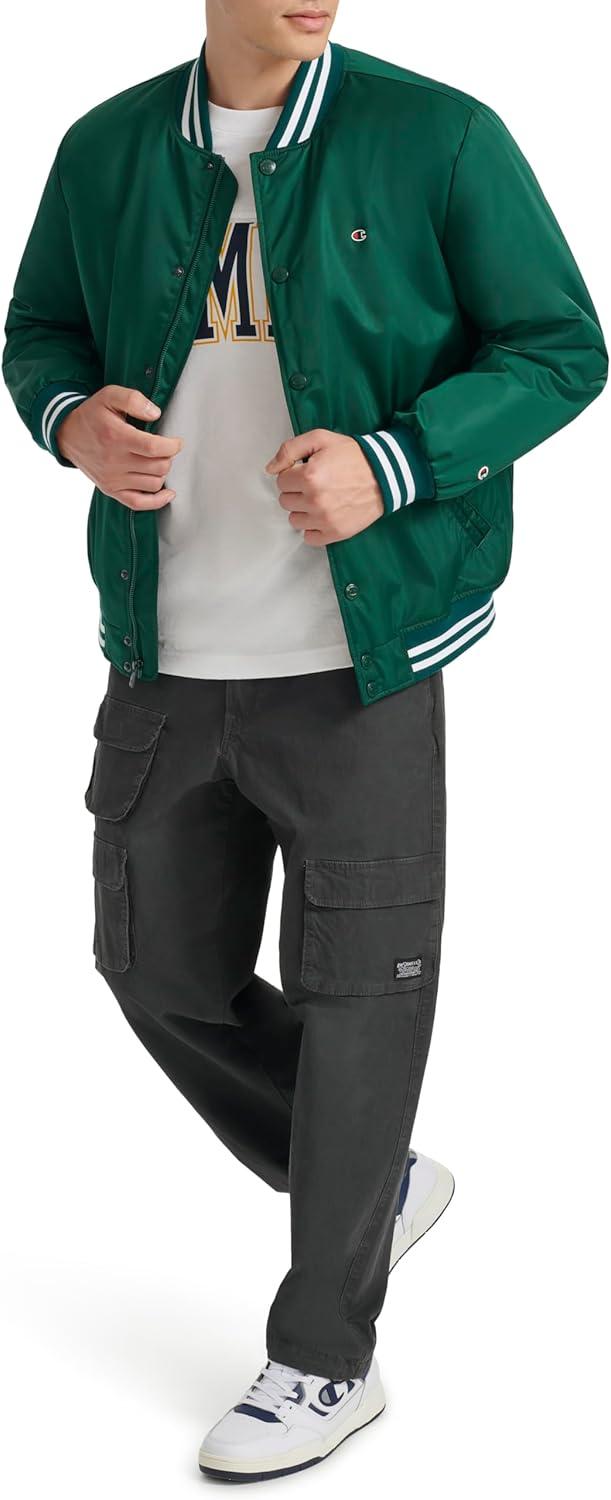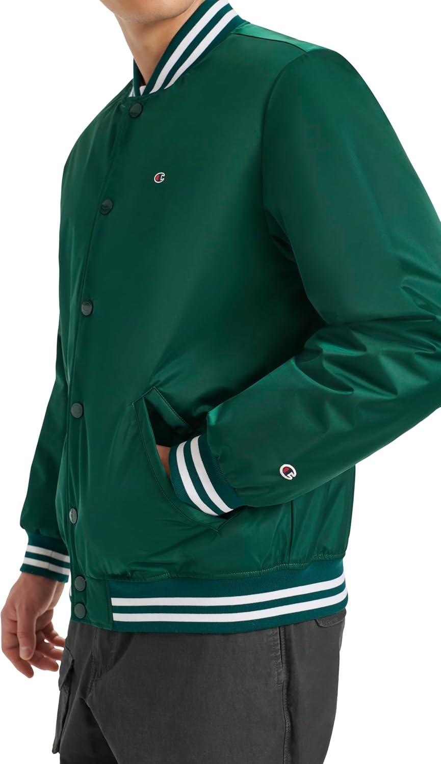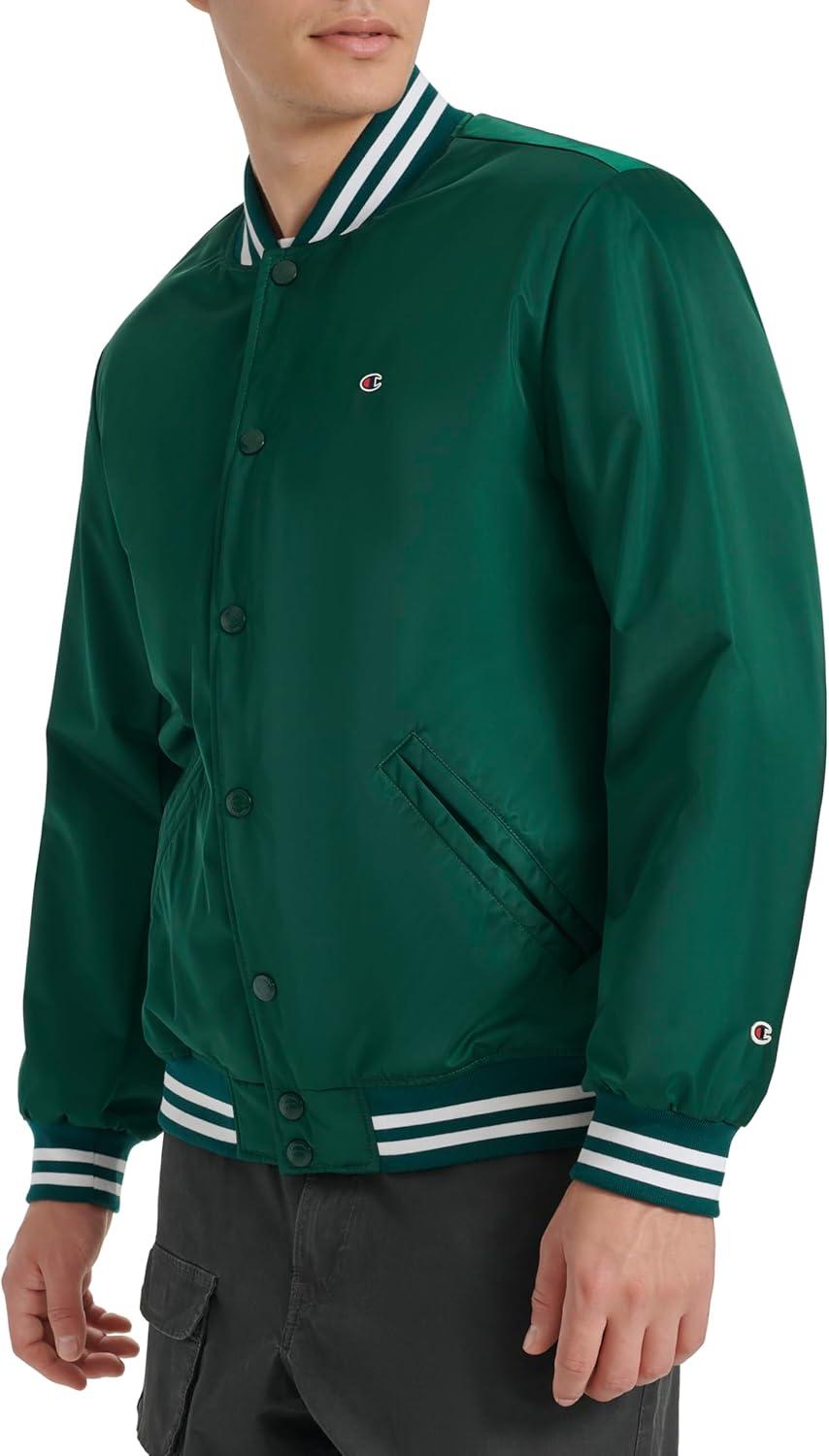 Champion mens Logo Striped-trim Varsity Jacket(Rain Forest)