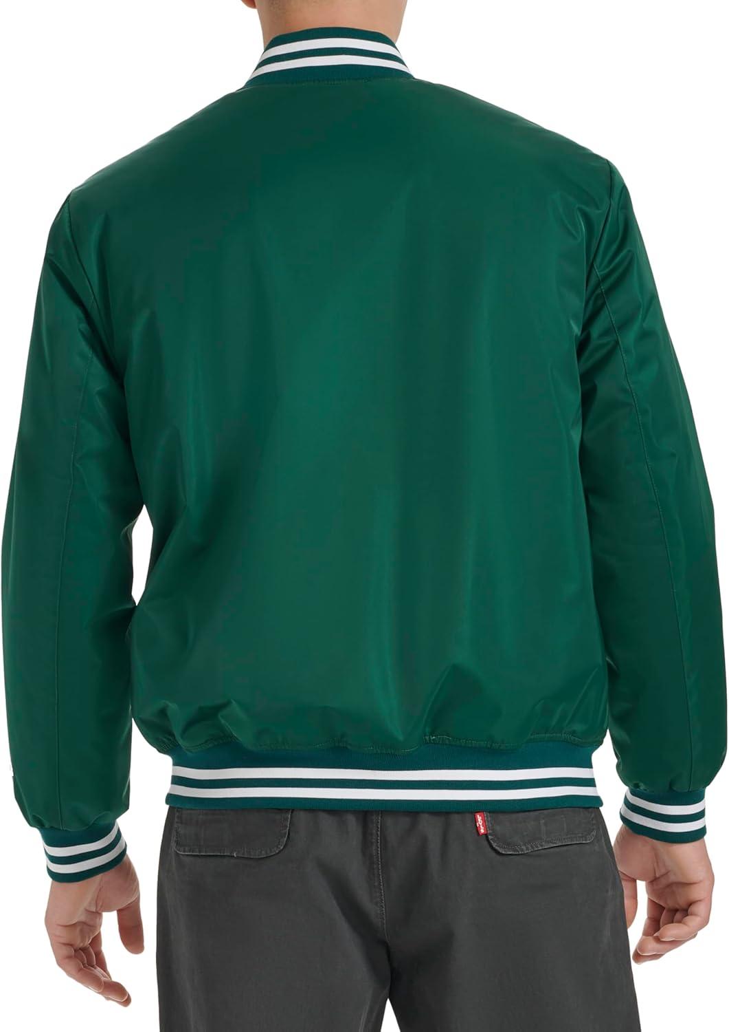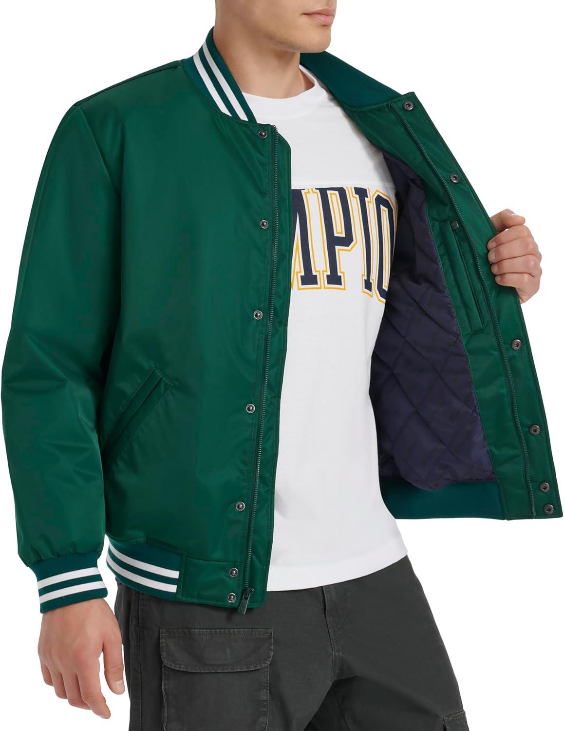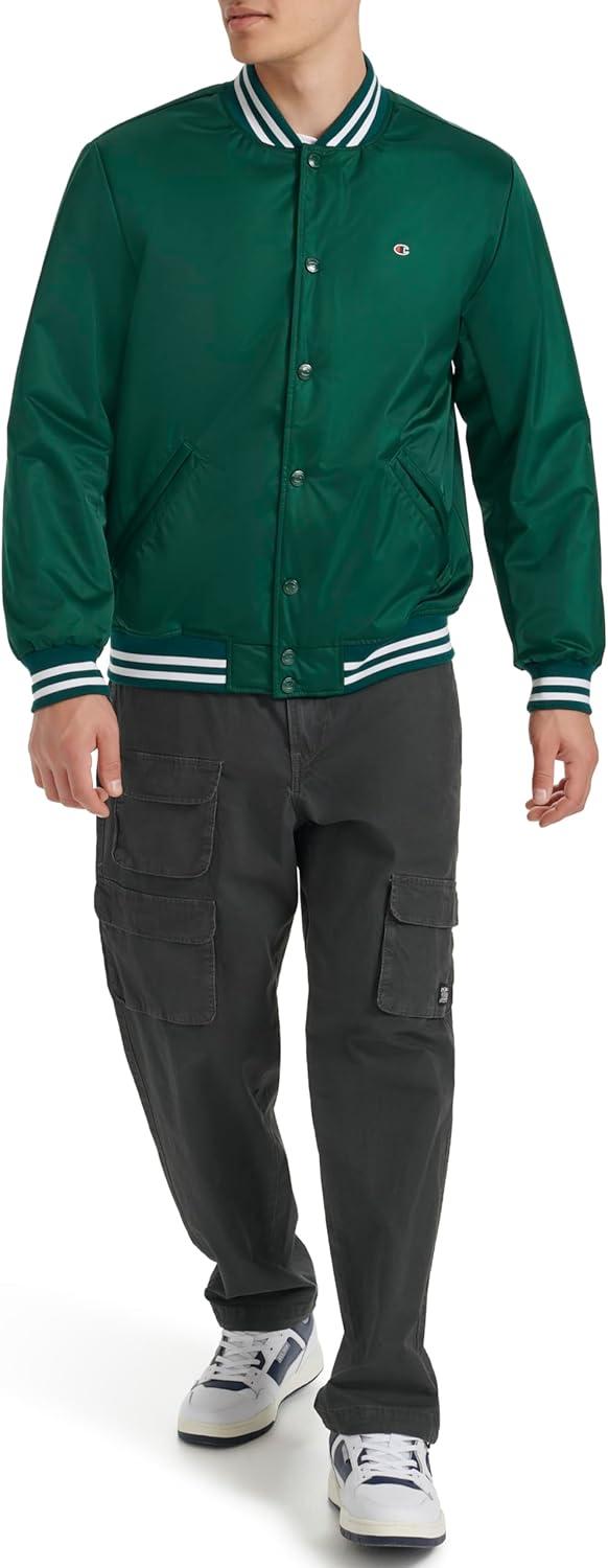 Champion mens Logo Striped-trim Varsity Jacket(Rain Forest)