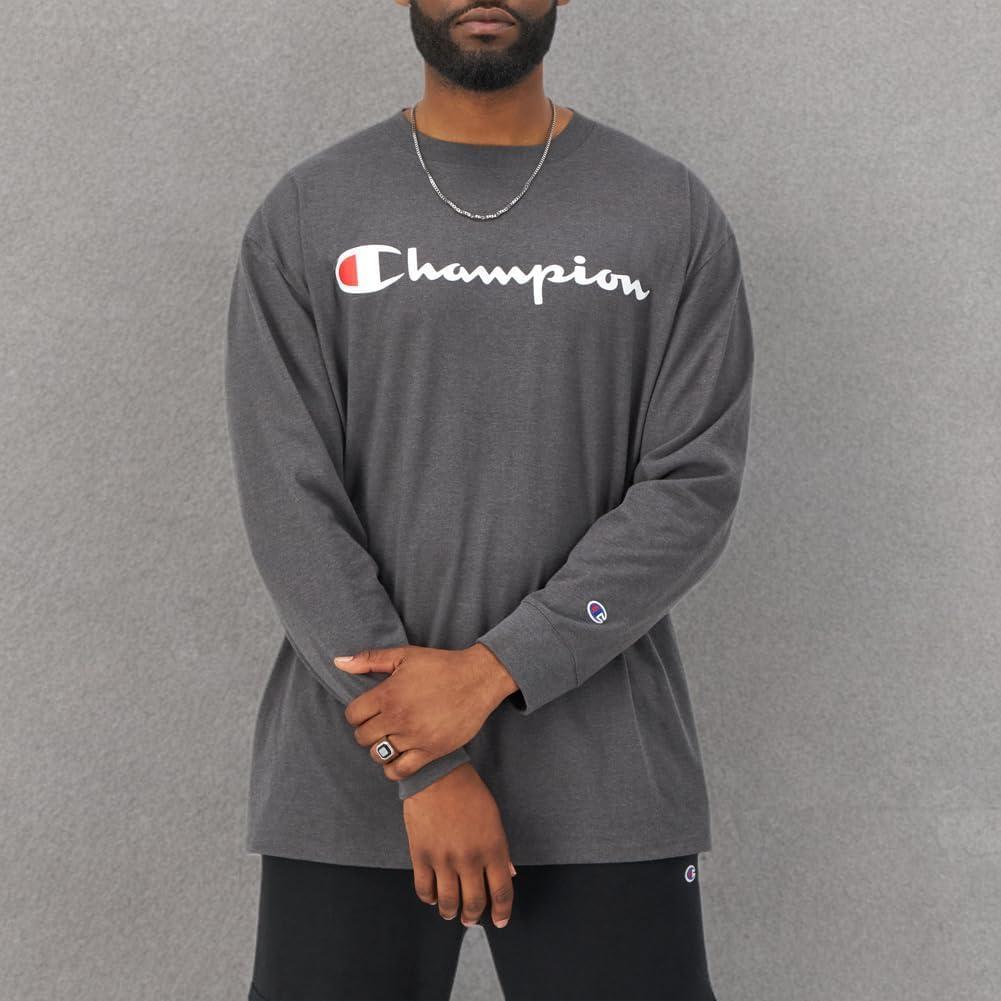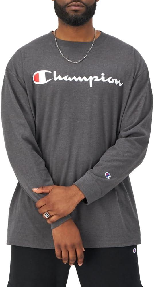Champion Men’s Long Sleeve T-shirt, Classic T-shirt for Men (Reg. Or Big & Tall)(Oxford Gray – Classic Script Logo)