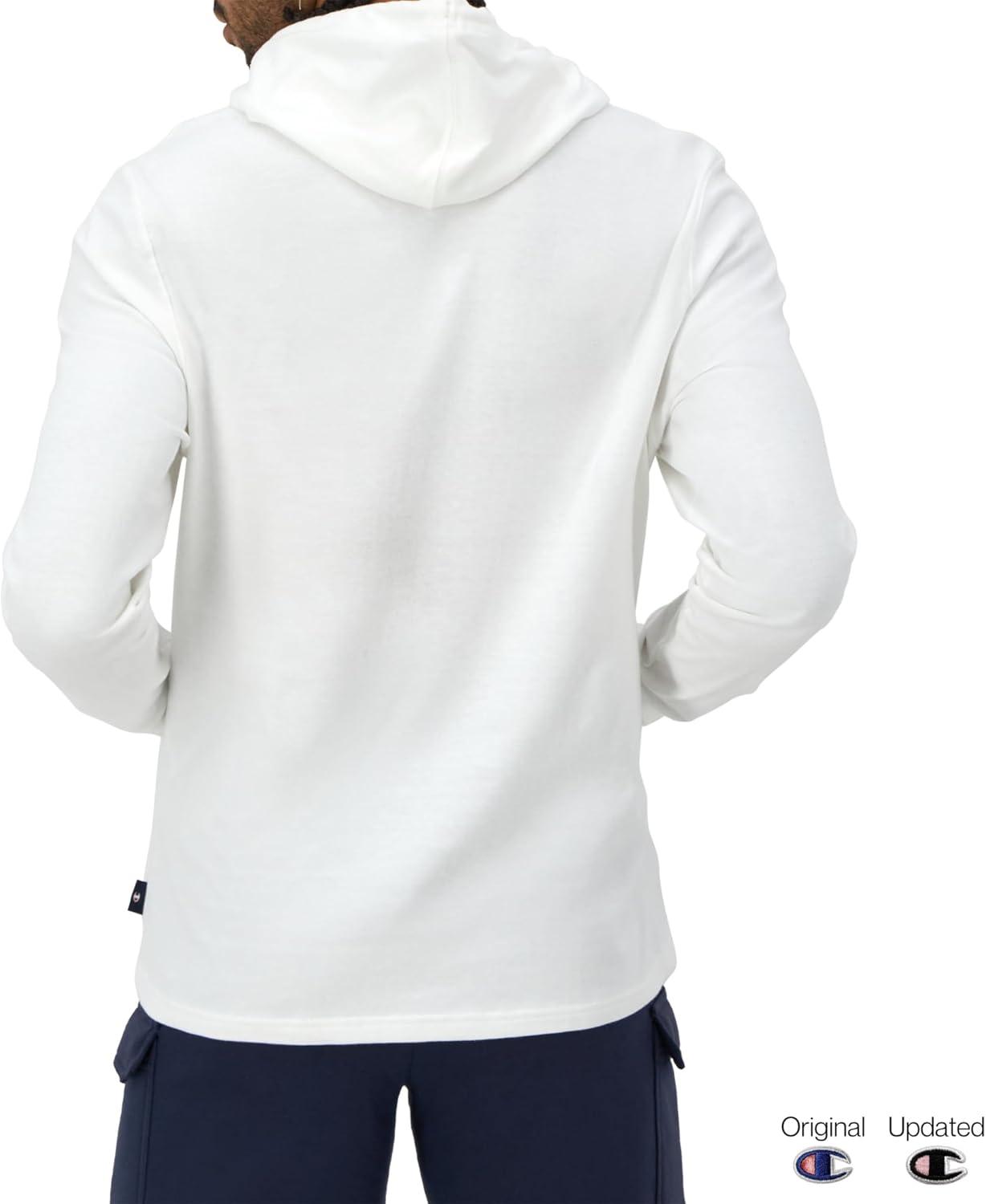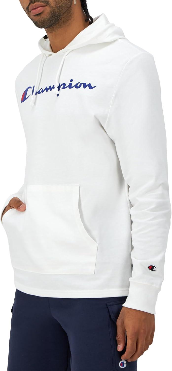 When the weather warms up and it's time to pack away your heavy fleece hoodie, reach for Champion's mid-weight jersey hoodie, which has all the style without the weight of fleece. This cotton jersey knit makes the perfect season-spanning layer, for a cool morning run, atop a tee with your jeans, even on the beach. Keeping it in your gym bag, your car, or take it along in your weekend tote where its versatility will serve you well. With classic hoodie styling, this cotton pullover has a drawstring hood, long sleeves with ribbed cuffs, and the essential kangaroo pocket. The straight sewn hem gives you plenty of room to move. Best of all, this jersey hoodie boldly displays the iconic Champion logo, with the “C” appliquéd on the left wrist. There are endless ways in which you'll appreciate the ease of this hoodie-style cotton jersey pullover for men.