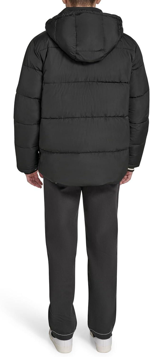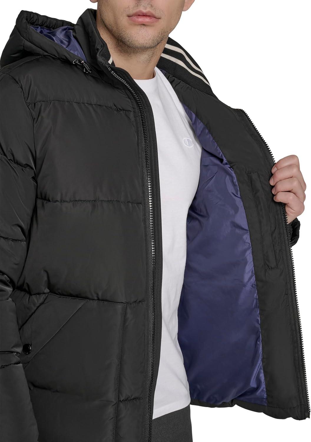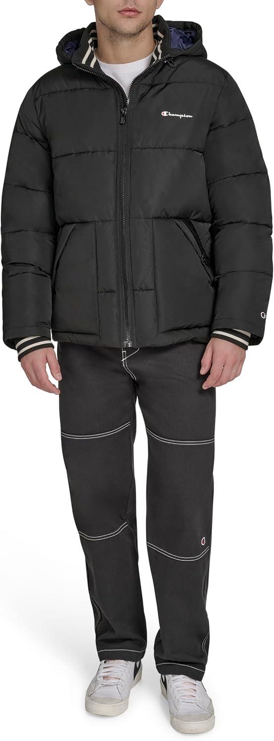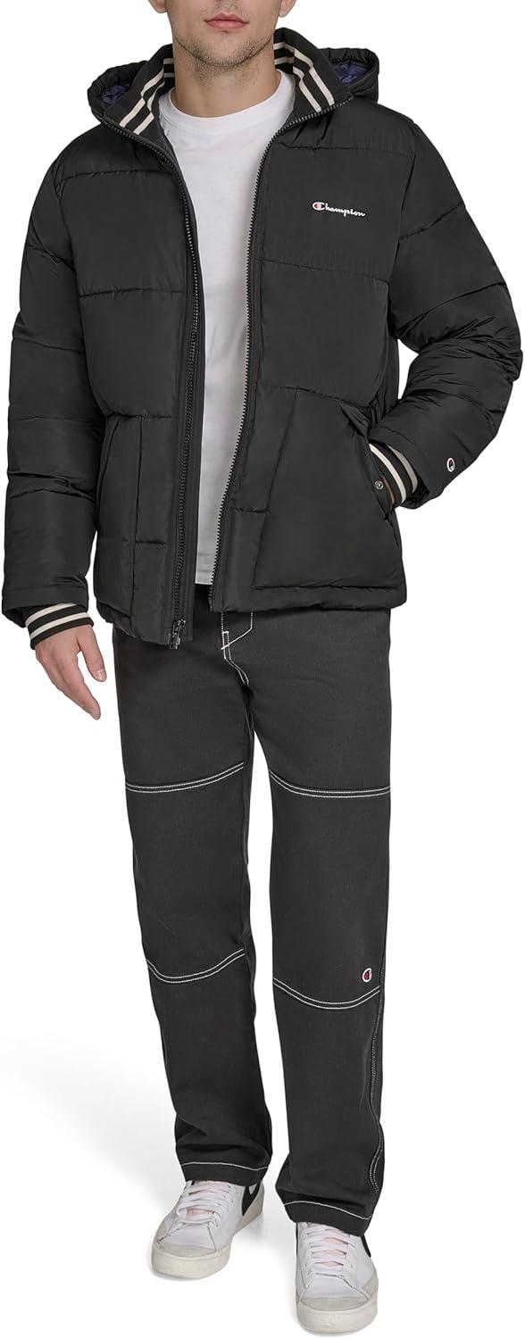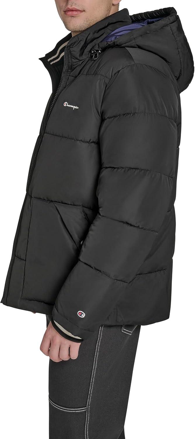 Champion mens Quilted Full-zip Hooded Puffer Jacket(Black Patch Pocket)
