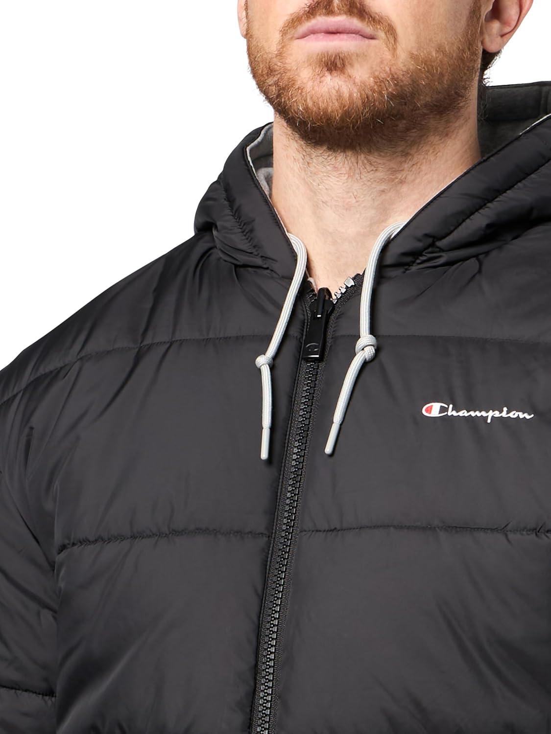 Champion Men's Reversible Puffer Jacket with Drawstring Hood(Black/Heather Grey)