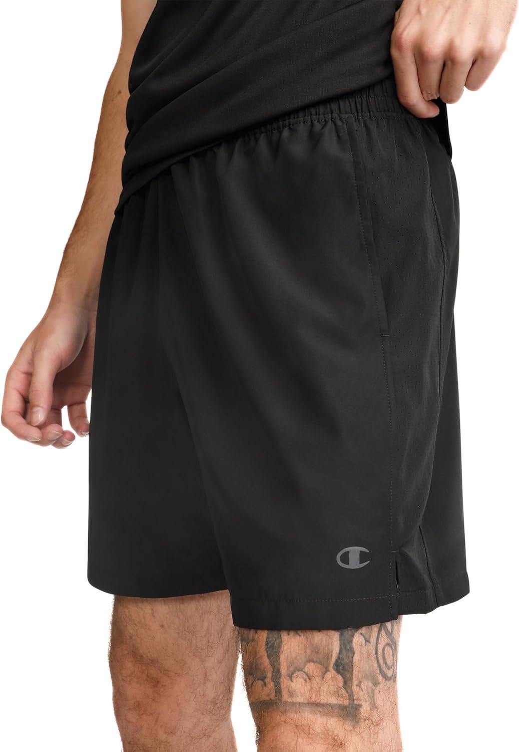 When you need super light, super easy, high performance gym shorts, Champion's® unlined athletic shorts are a smart choice. Even during a sweaty workout or an intense pickup game, these woven training shorts wick moisture away from skin with Double Dry™ technology so you stay cooler and drier. Their mid-thigh length with a 7″ Inseam makes them an ultra-versatile silhouette, combining the best of short running shorts and long basketball shorts. Even better, they have airy mesh inset panels at the sides for extra ventilation, and side vents for maximum range of motion. You'll welcome side-seam pockets and a comfortable inner drawstring to adjust the waist. Brand fans will appreciate the Champion “C” logo on the left leg. These lightweight performance shorts are the ultimate in reliable, all-purpose utility shorts.