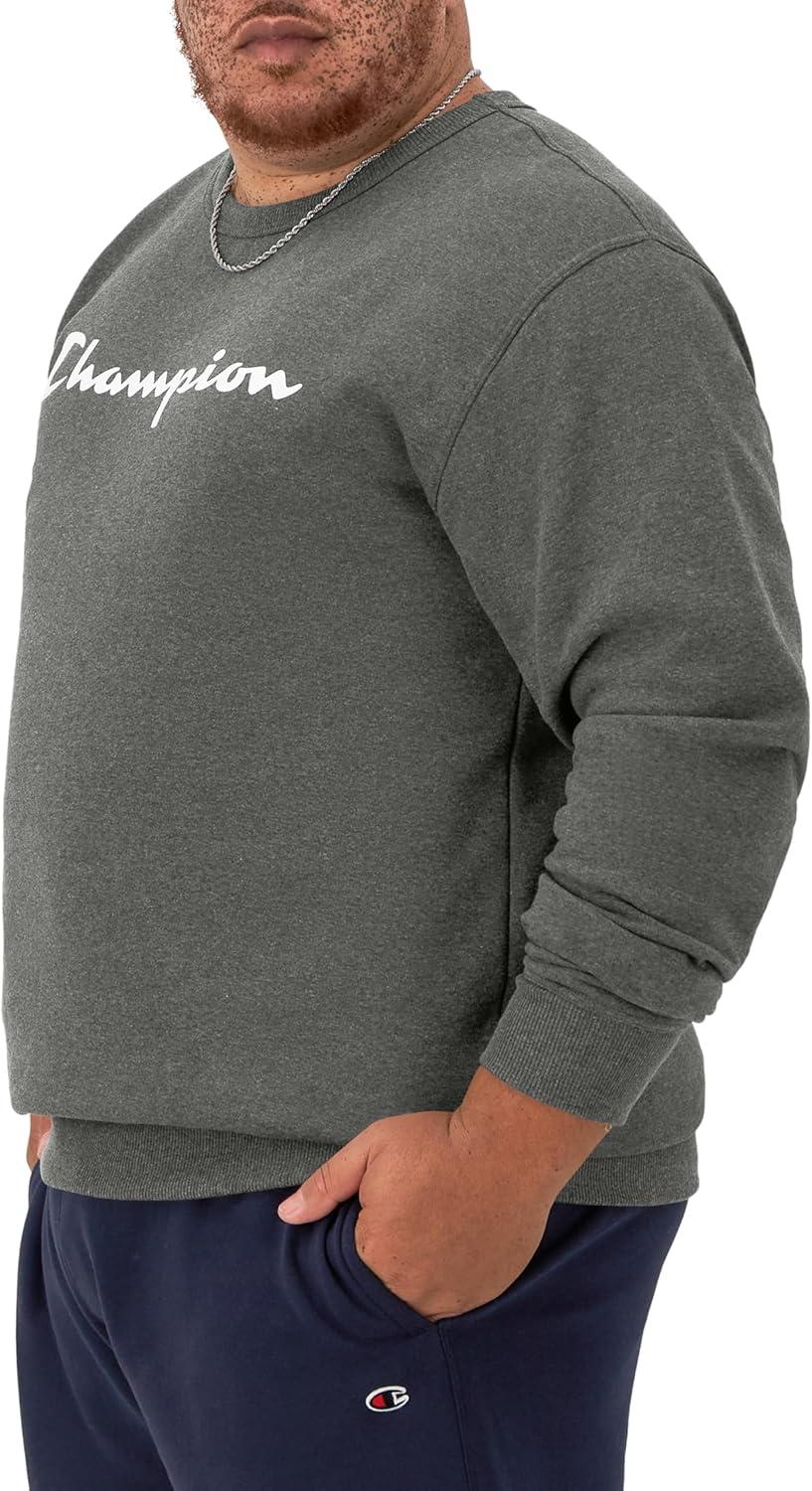 THE CLASSIC CREWNECK. Detailed with the iconic script logo graphic, this men's Big & Tall crewneck sweatshirt brings the comfort. Crafted with signature Powerblend® Fleece, this men's crewneck sweatshirt has a soft, brushed interior for warmth without weighing you down. High quality, cotton-blend fabrication delivers a sweatshirt that's made to be a longtime favorite. Extra stitching creates a sturdy finish, while ribbed cuffs and a lay-flat hem add to its signature appeal. A standout choice for both comfort and style, this Champion style is a winner in any rotation.