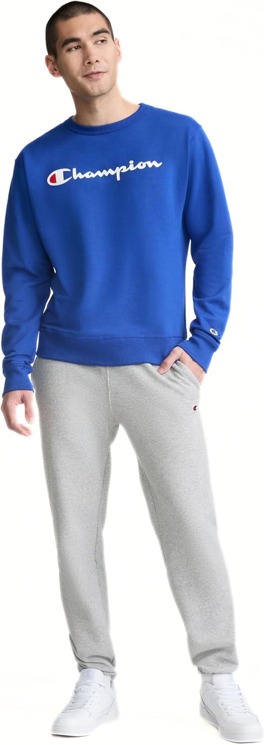 THE CLASSIC CREWNECK. Detailed with the iconic script logo graphic, this men's Big & Tall crewneck sweatshirt brings the comfort. Crafted with signature Powerblend® Fleece, this men's crewneck sweatshirt has a soft, brushed interior for warmth without weighing you down. High quality, cotton-blend fabrication delivers a sweatshirt that's made to be a longtime favorite. Extra stitching creates a sturdy finish, while ribbed cuffs and a lay-flat hem add to its signature appeal. A standout choice for both comfort and style, this Champion style is a winner in any rotation.