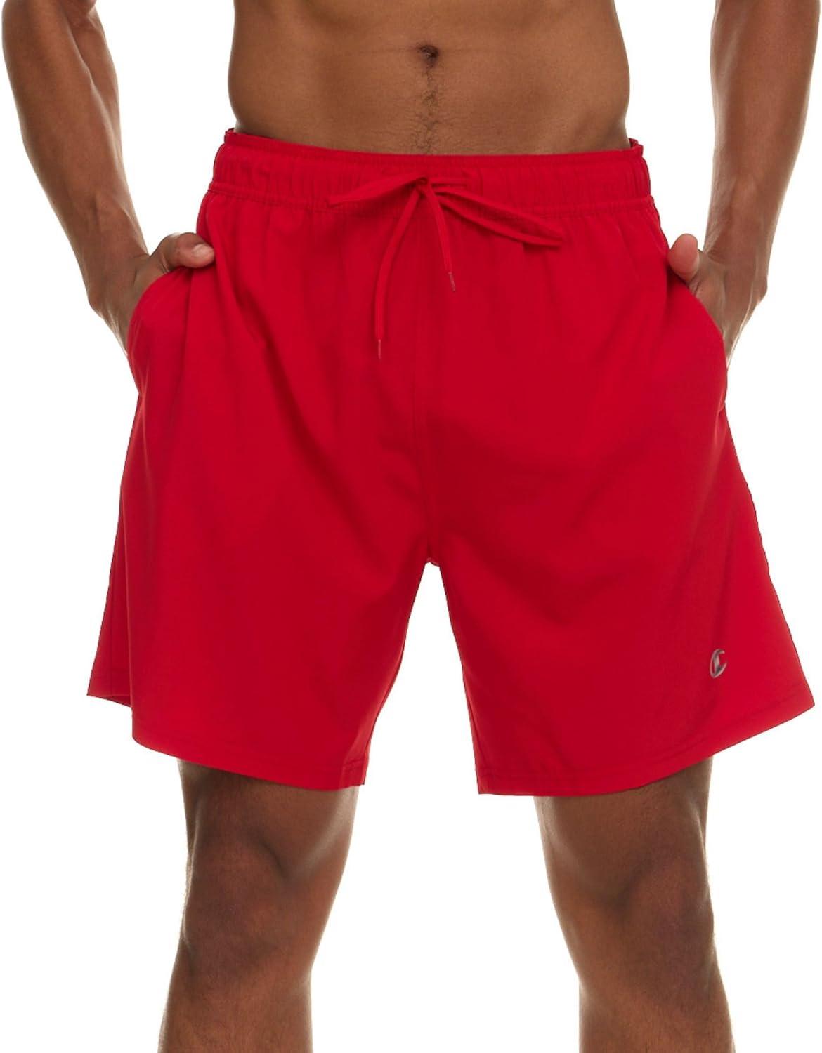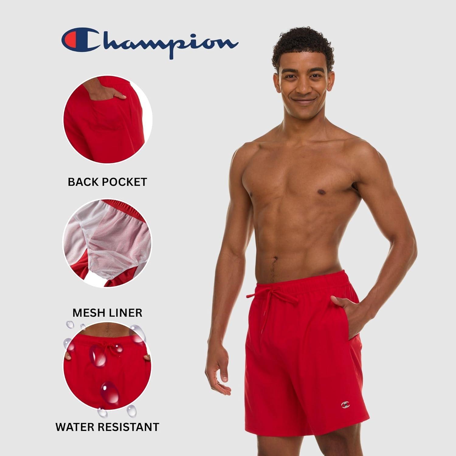 Champion Mens Swim Trunks with Mesh Liner, 7" Inseam Quick Drying Mens Bathing Suit, Board Shorts for Swimming and Beach(Red)