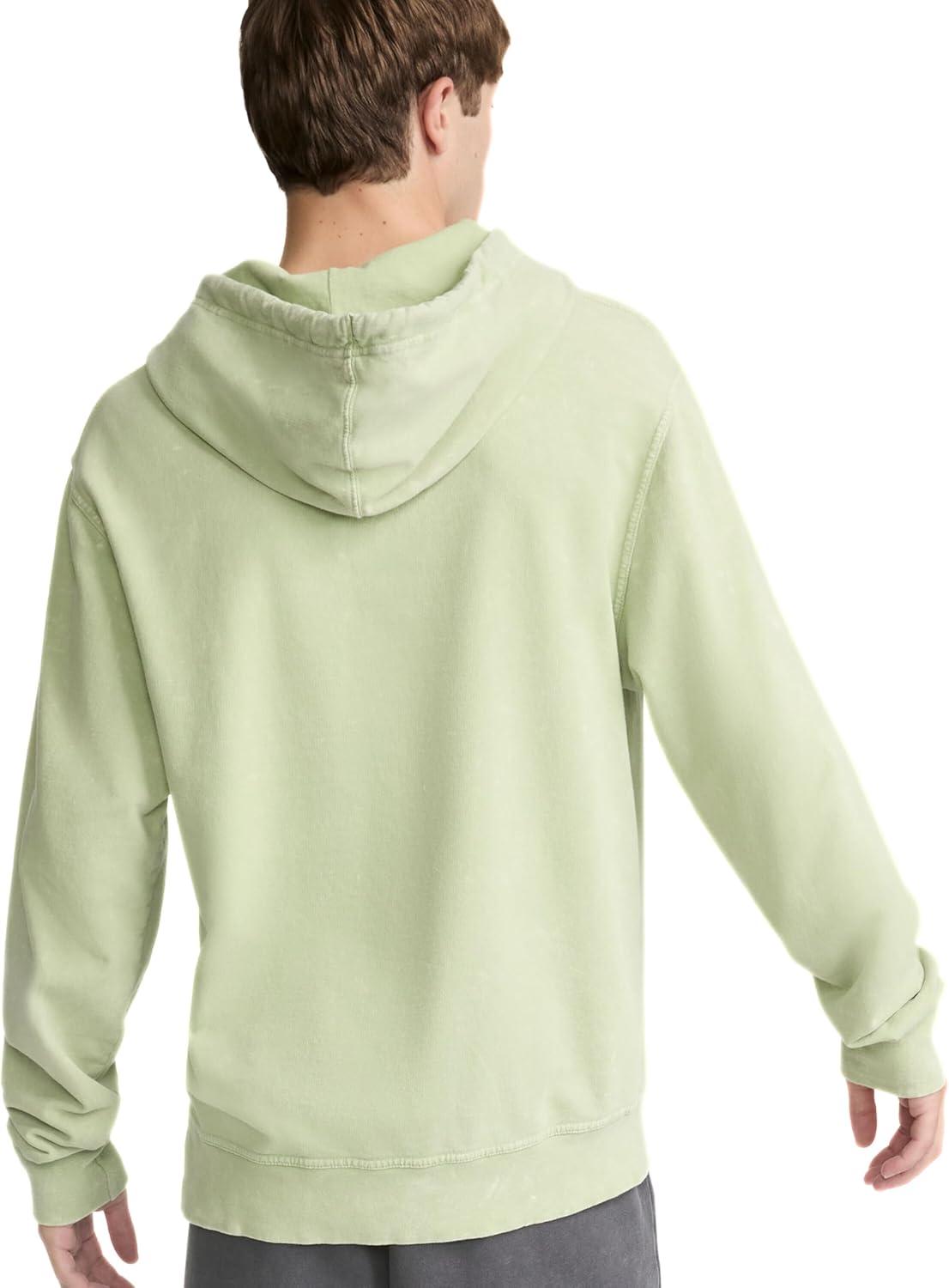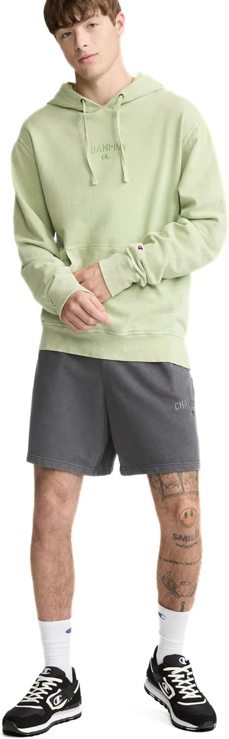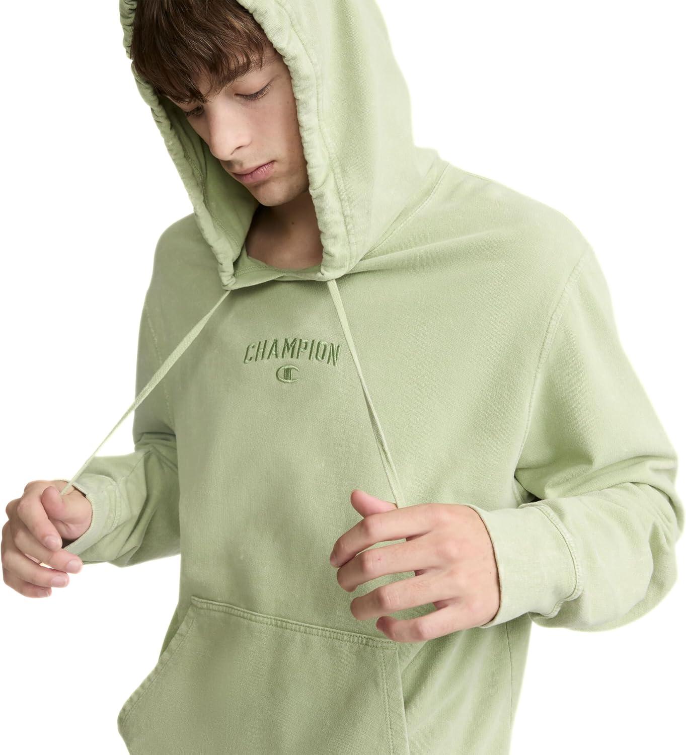 LIGHTWEIGHT AND LOUNGE-READY Reach for this men's hoodie when it's time to layer up for the season. It's crafted from lightweight fleece brushed for extra softness and warmth with specialty dye that gives each hoodie a unique look vintage feel. Flat tied back drawcords metal grommets adds a hint of modern detailing to this comfortable hoodie for men, while a kanga pocket and ribbed trim offer classic touches. The clean tonal embroidered Champion logo on the front and iconic C patch at the wrist add a clean branded finish.