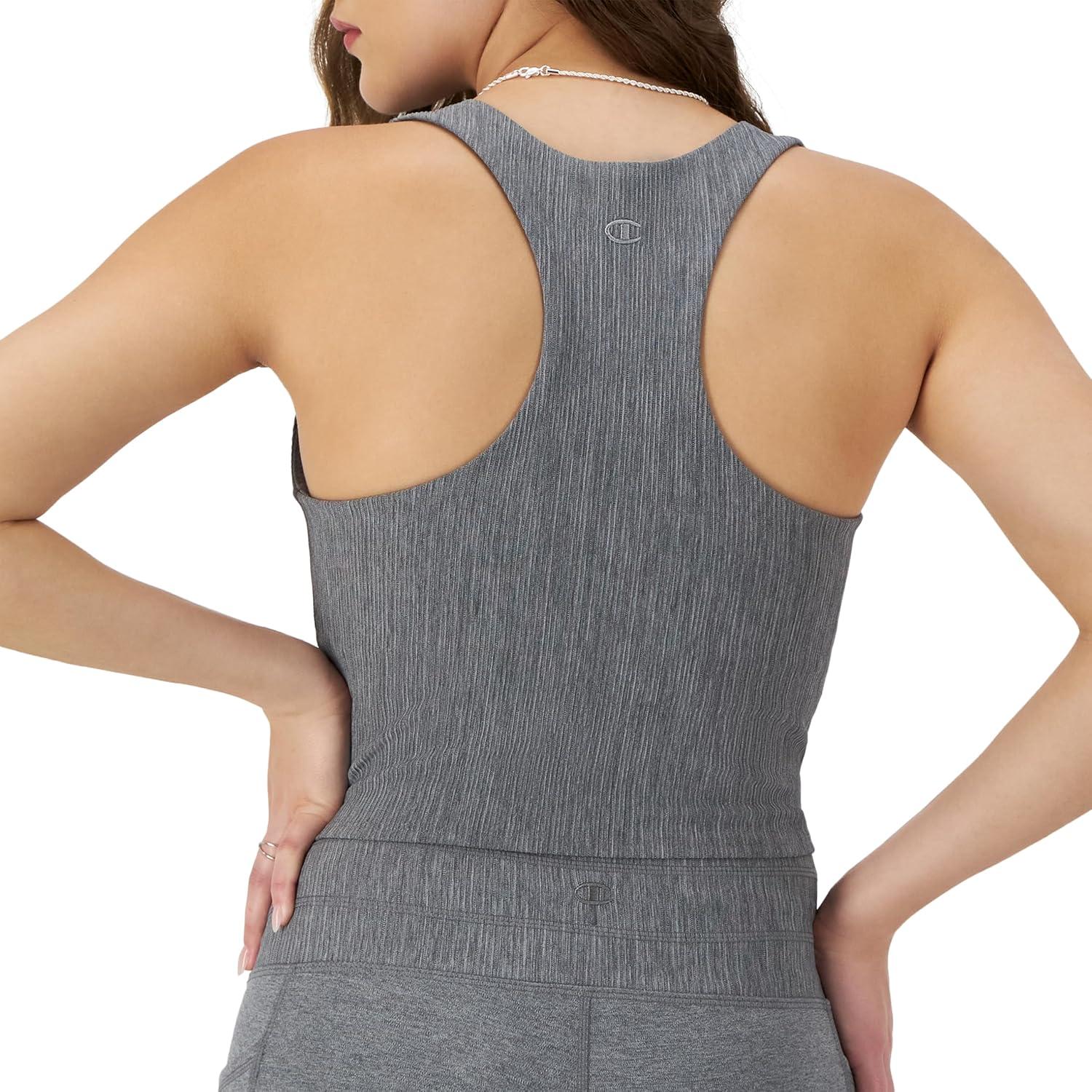 CUTE CROP TOP FOR EVERYDAY. This cropped tank top is soft, stretchy, and ready for all your big moves. Fully equipped with a shelf bra and perfect for sweaty yoga or Pilates classes, this tank is ribbed and brushed for buttery softness that flatters and feels great on the skin. It features moisture-wicking and odor-control technologies that manage sweat and smell, so you don't have to. Rock this crop top with your best Champion leggings for studio classes or with denim for an afternoon on the town. The iconic C patch sits at the center back of this ribbed tank for women.