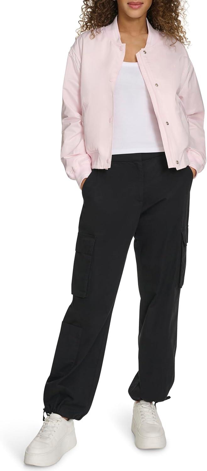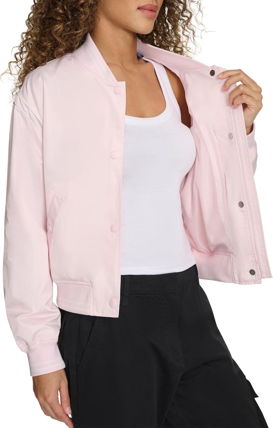 Dual Closure: Center front snap closure with hidden zipper offers a secure, adjustable fit. Functional Snap Pockets: Two lower snap pockets offer secure storage while maintaining the jacket’s sleek silhouette. Classic Varsity Details: Stripe rib knit at the cuffs, hem, and collar adds a timeless varsity-inspired touch. Chic Satin Fabric: Soft, lightweight satin gives the jacket a stylish, glossy finish for a modern, sporty look. Champion Branding: Features the iconic Champion logo at the chest for a bold, signature athletic style.