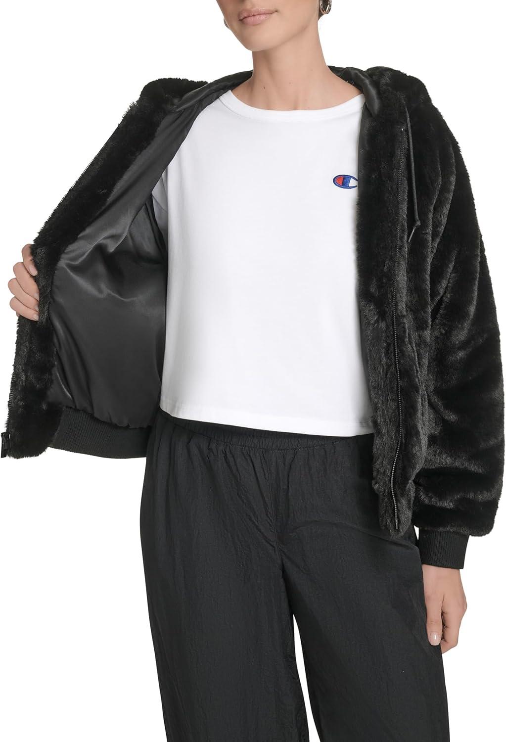 Champion womens Faux Fur Hoody Bomber Jacket(Black)