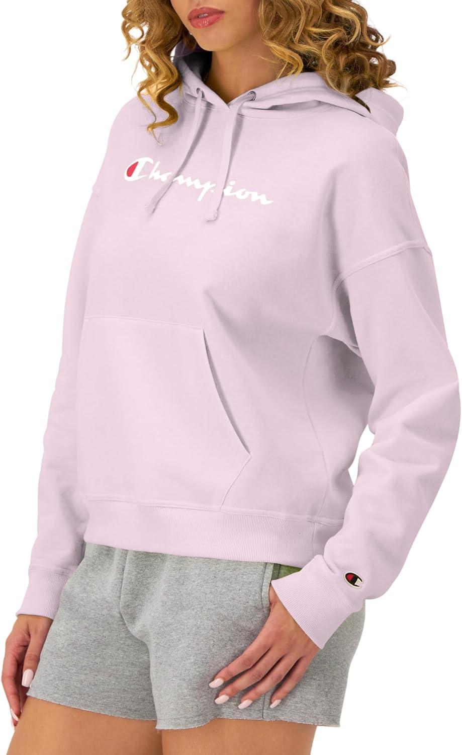 Champion Women’s Pullover Fleece Hoodie, Loose Fit, Midweight, Script Logo(Chantilly Pink Script)