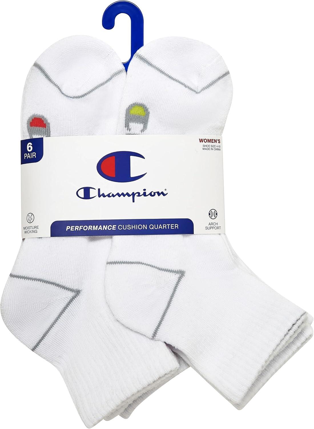 Champion Women's Quarter Socks – 6-Pack Cushioned Athletic Socks with Moisture-Wicking, Arch Support (Size 5-9)(Bright White)