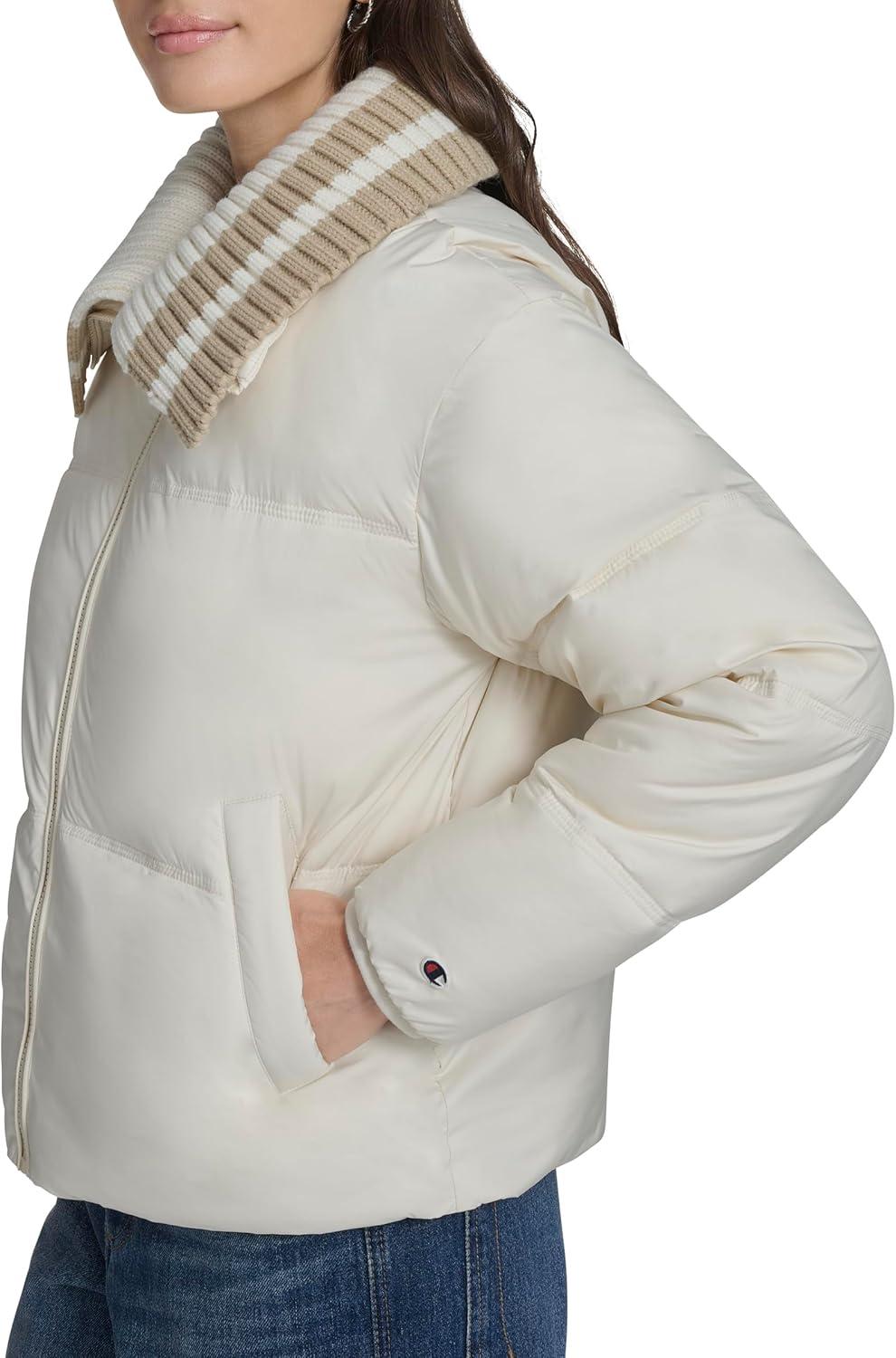 Stay warm and stylish with the Champion Women's Quilted Shawl Collar Puffer Jacket. Featuring horizontal quilting and a sporty striped knit shawl collar, this jacket blends cozy comfort with classic Champion detailing.