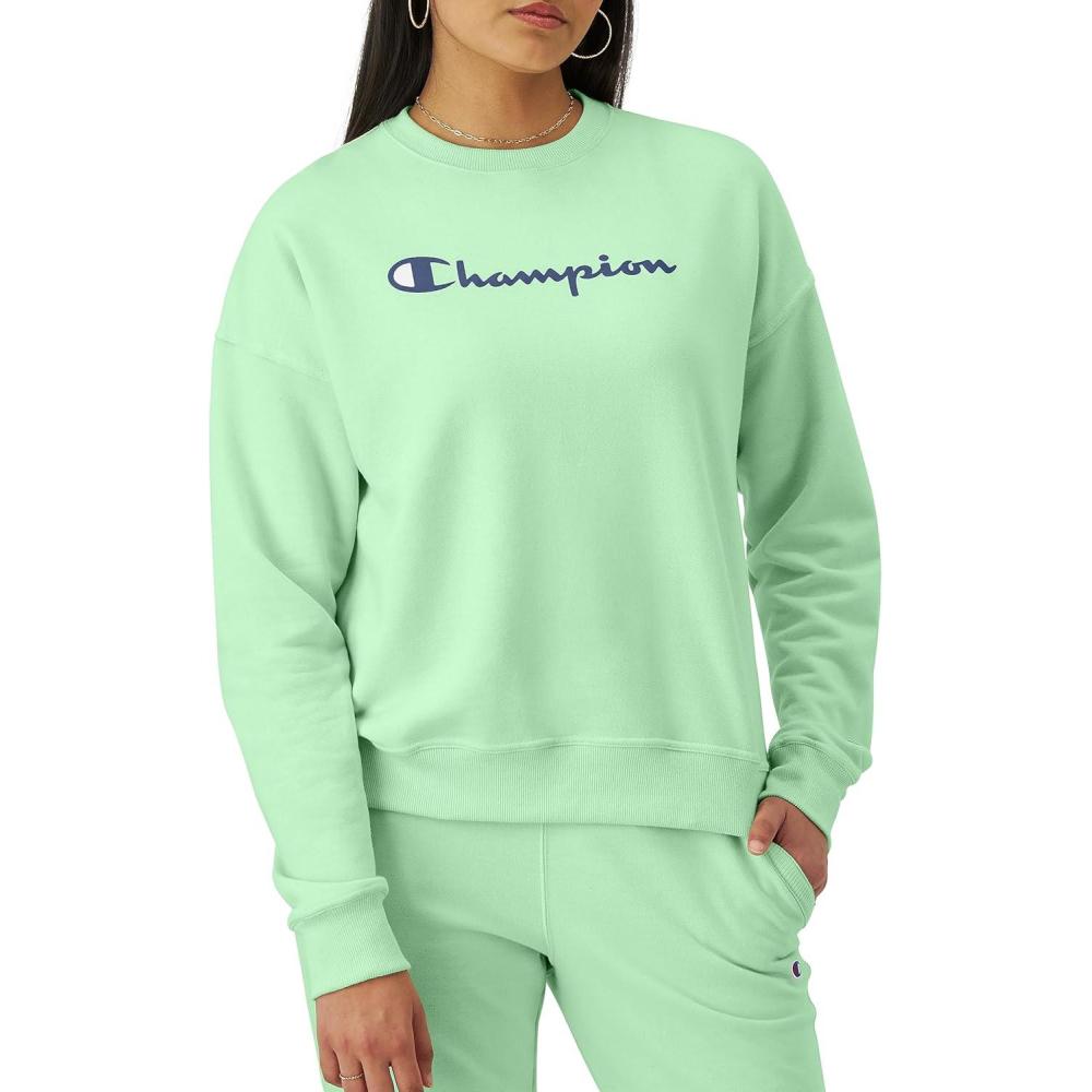 Champion Women's Sweatshirt, Fleece, Crewneck Sweatshirt, Warm Sweatshirt for Women (Plus Size Available)(Happy Spring Green Script)