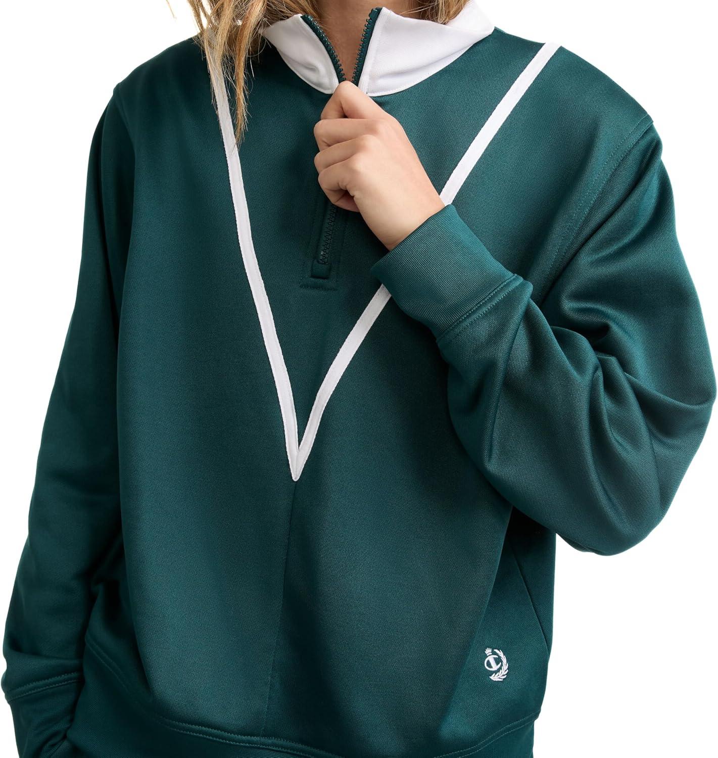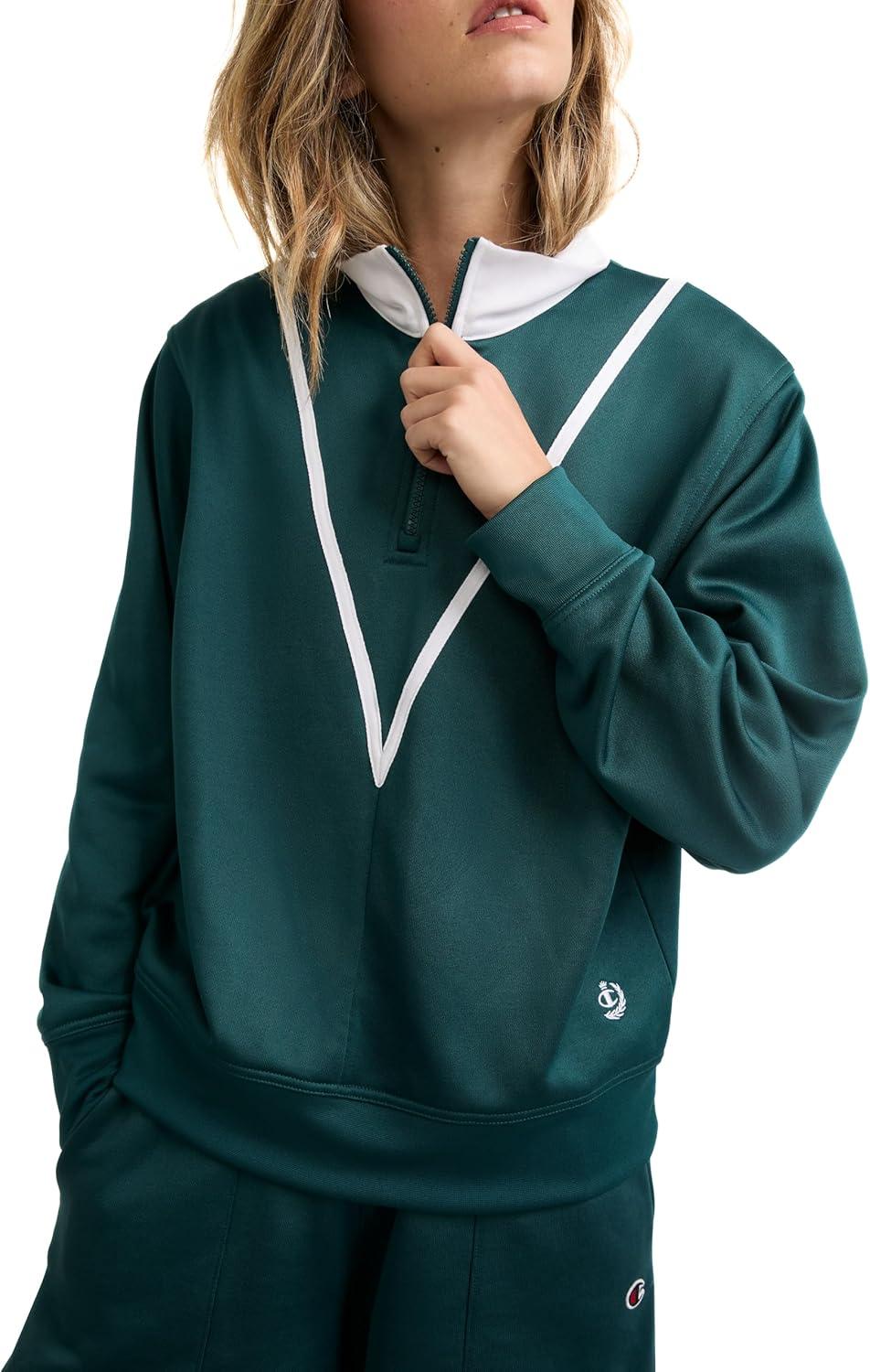 PULLOVER MADE FOR THE COURTS – This cute, tennis-ready 1/4 pullover for women is sure to become the next major player in your rotation. Made from a midweight cotton/poly blend, this pullover has contrast ribbed collar and V piecing for extra style. The sporty look is perfect for pairing with your favorite Champion tee or shorts. Dropped shoulder for a relaxed fit and embroidered C Logo with crown and laurel at the hem so everyone knows what you're all about.